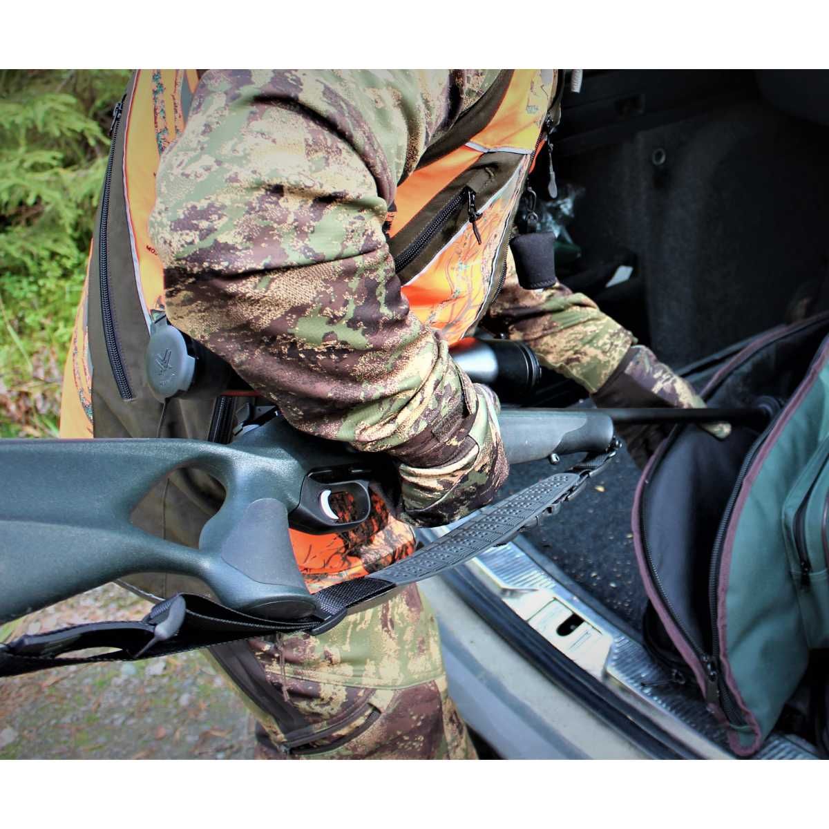 Nastavitelný dvoubodový zbranový popruh. Použitelný za všech podmínek. Made in Finland.