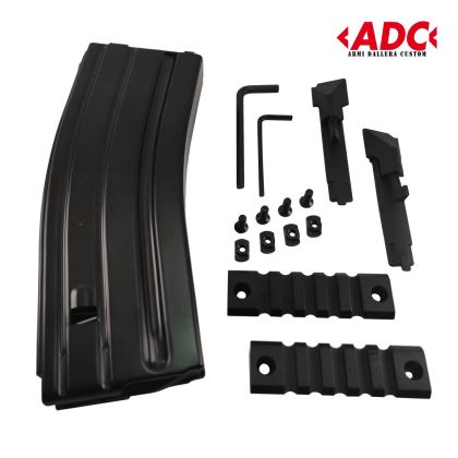 Obsah balení: zbran, návod k obsluze, 2x sekce railu pro predpažbí, 2x vymezovací vložka pažby (zásobník není soucástí)