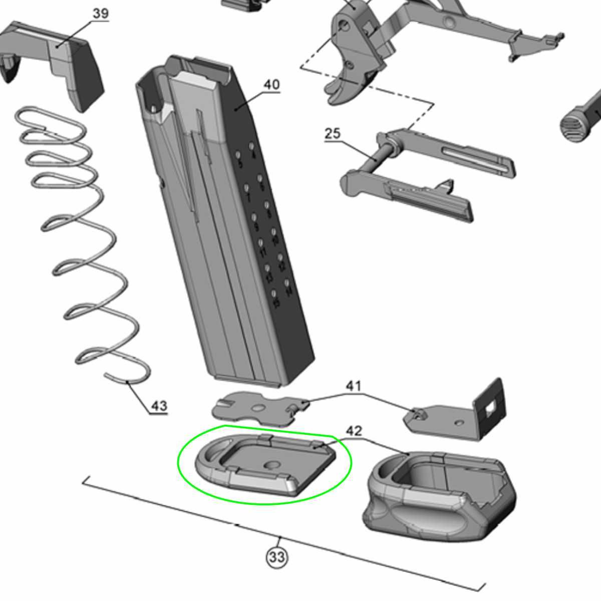Pro kompletaci nutné kombinovat s pružinou (2695111) a dnem zásobníku 15 náboju (2670089).
