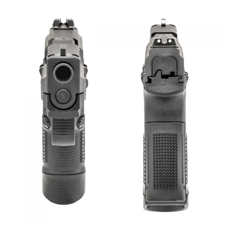 Pistole služebního charakteru s polymerovým rámem a pažbickou s výmennými hrbety se zásobníkem na 12 náboju.