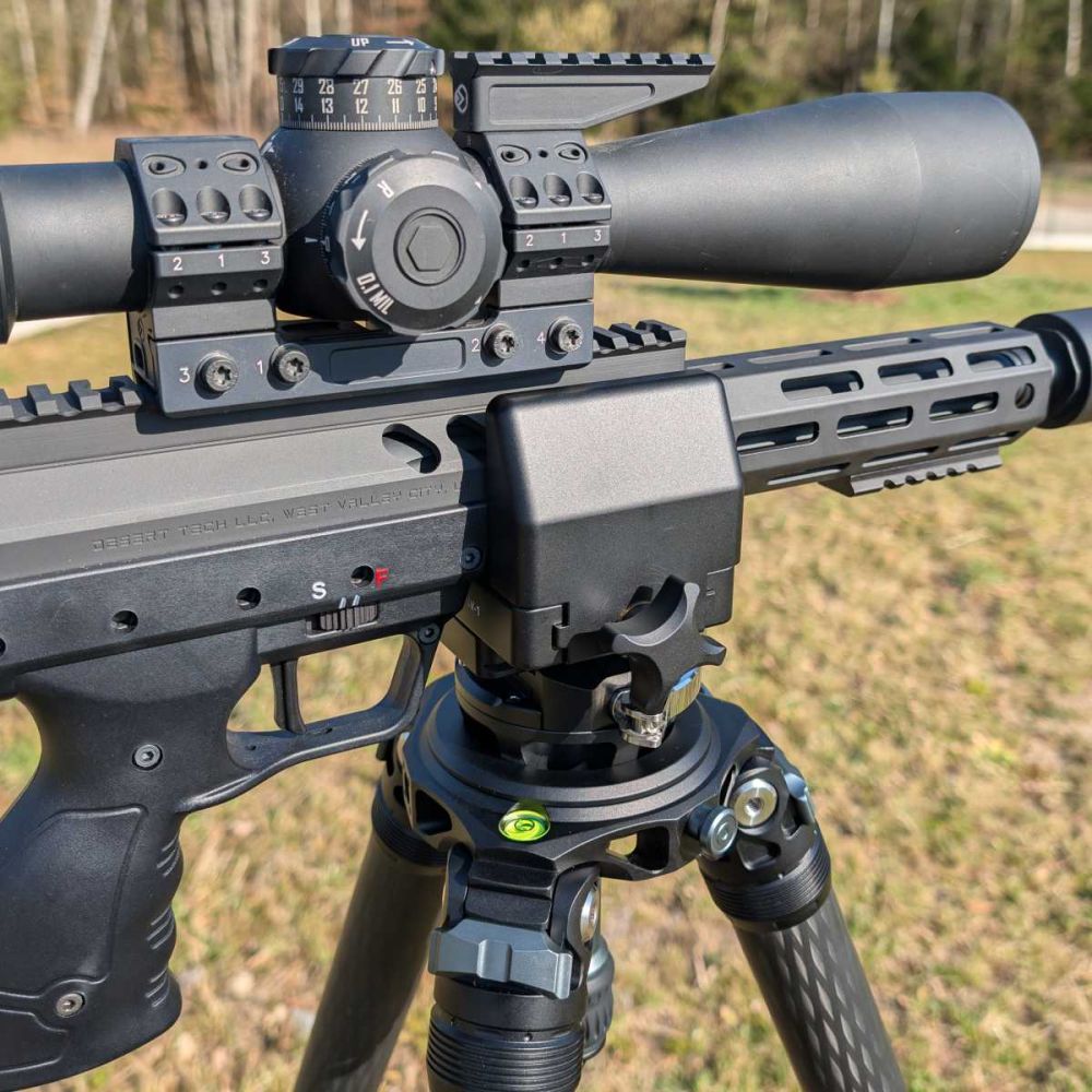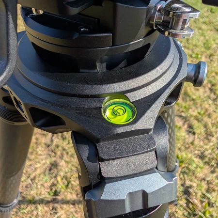 Vyrovnávací kulová hlavice stativu s vodováhou pro snadné a rychlé připevnění adaptéru či držáku upínajícího zbraň.