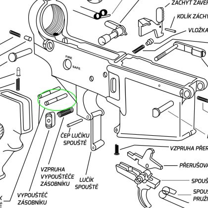 Při instalaci nebo servisu spoušťového ústrojí doporučujeme zkontrolovat stav obou kolíků. Jakékoli vymačkání nebo deformace mohou vést k nespolehlivé funkci zbraně nebo k nepravidelnému odporu spouště. Kolíky jsou navrženy pro snadnou montáž a demontáž pomocí standardních puškařských vyrážečů.