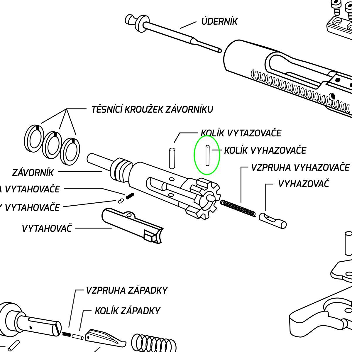 Náhradní kolík vyhazovače pro pušky AR-15.