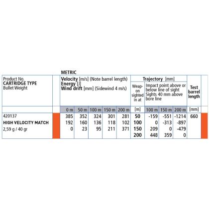 | High Velocity Match | rychlost (m/s) | energie (j) | snos vetrem (mm) |
