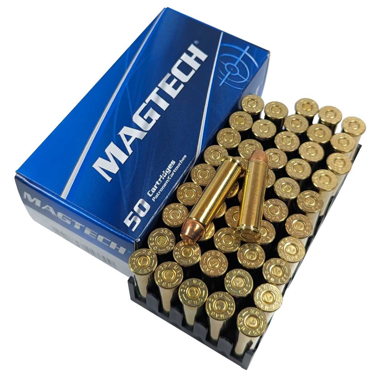Revolverové náboje Magtech 357 Magnum s celoplášťovou střelou s plochou špičkou FMJ FLAT (Full Metal Jacket Flat) o hmotnosti 8,1 gramů / 125 grainů nabízejí střelcům vysoce výkonné náboje pro cvičnou střelbu na terč.