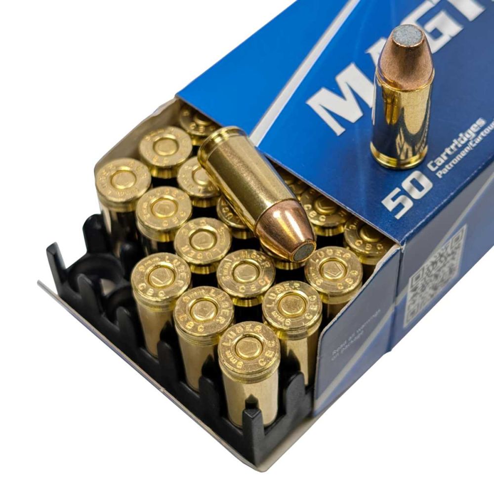 Pistolové náboje Magtech 9 mm Luger / 9x19 s poloplášťovou střelou bez drážek (without grooves) JSP (Jacketed Soft Point Flat) o hmotnosti 6,15 gramů / 95 grainů.