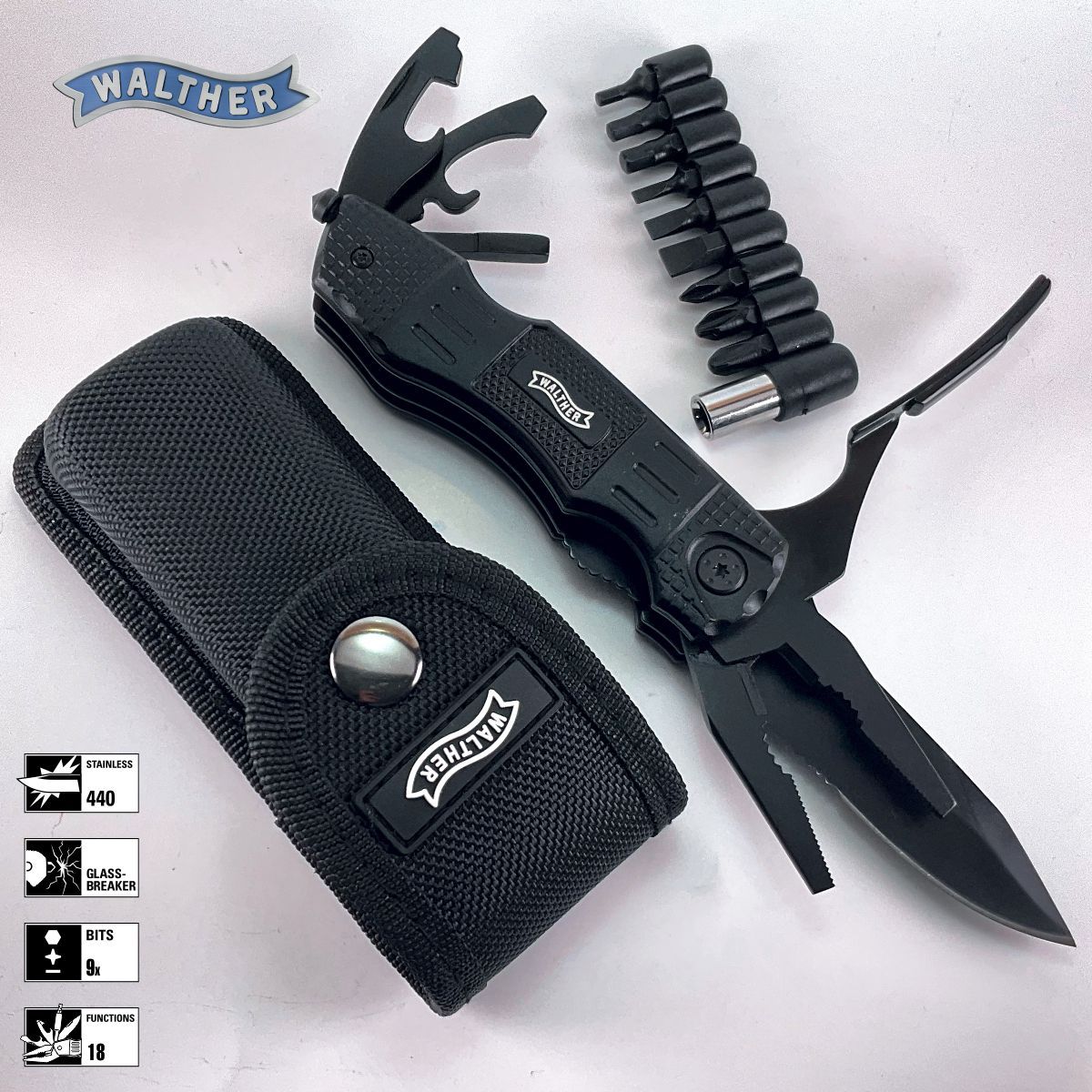 Součástí balení je také kvalitní nylonové opaskové pouzdro, ve kterém se kromě samotného nástroje nachází i sada devíti výměnných bitů (křížové, ploché i šestihrany) s magnetickým nástavcem. Walther Multi Tack je ideální volbou pro ty, kteří chtějí mít celou sadu nářadí neustále po ruce v jednom elegantním a funkčním balení.