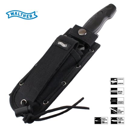 Nůž Walther FBK pro je dodáván spolu s multifunkčním nylonovým pouzdrem, které nabízí řadu možností upevnění jak vertikálně, tak horizontálně. Na pouzdře naleznete drobnou kapsu pro přenos malého zavíracího nože, svítilny, baterie a nebo dalšího vybavení.