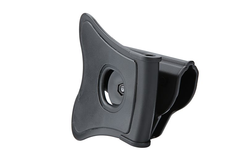 Uchycení pomocí tzv. pádla za opasek. Zadní úchyt umožnuje rotaci 360 stupnu pro individuální nastavení.