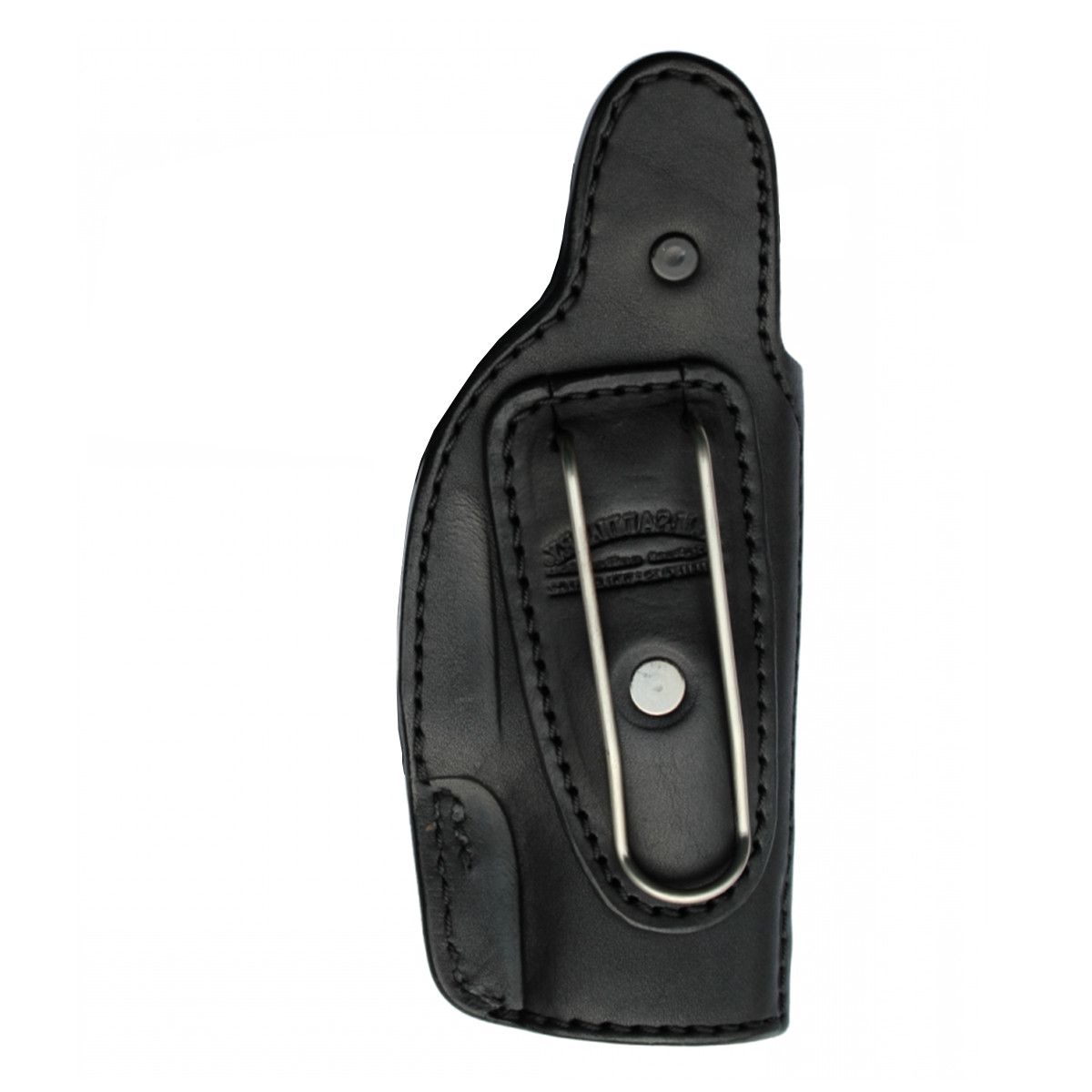 Tvarované pouzdro na pistoli, dole otevrené s pérovým závesem.