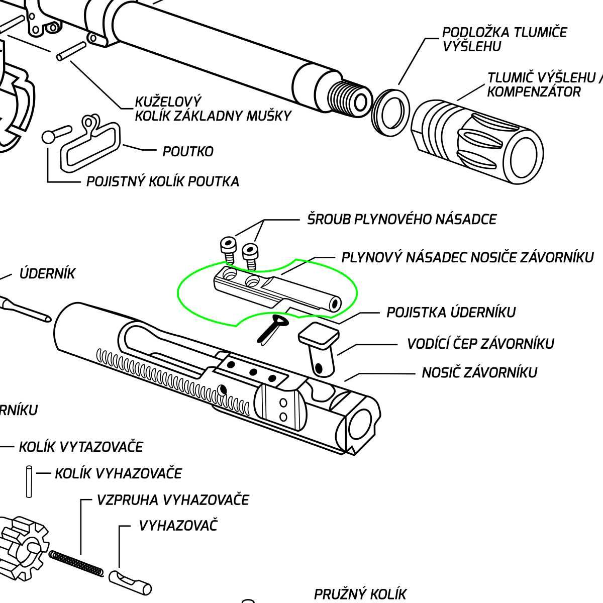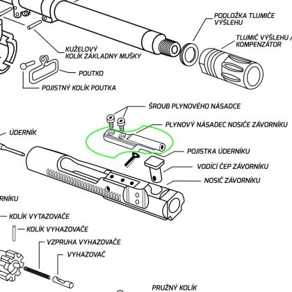 Náhradní plynový násadec nosiče závorníku pušky platformy AR-15.