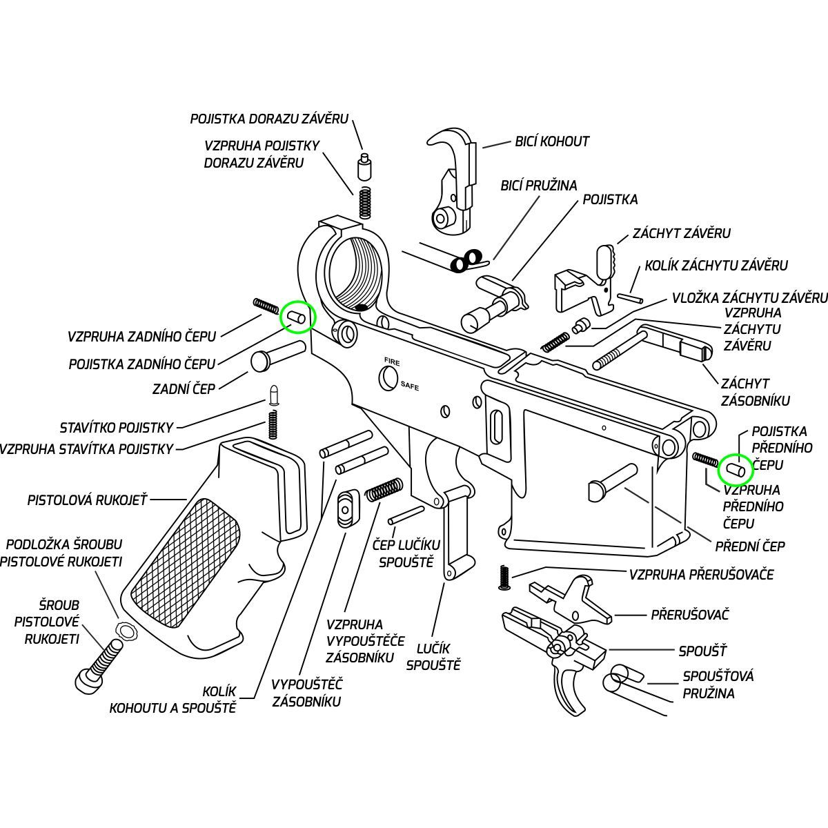 Pojistka zadního i předního čepu (tzv. rozborného čepu) pušky AR-15