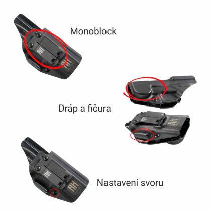 Pro dokonalé prilehnutí pažby zbrane je tu integrovaný dráp, který zevnitr tlací do kalhot/opasku a odtlacuje rukojet smerem k telu. Ficura naopak tlací na stehno, a tím vše, co je nad opaskem, tlací smerem k telu.