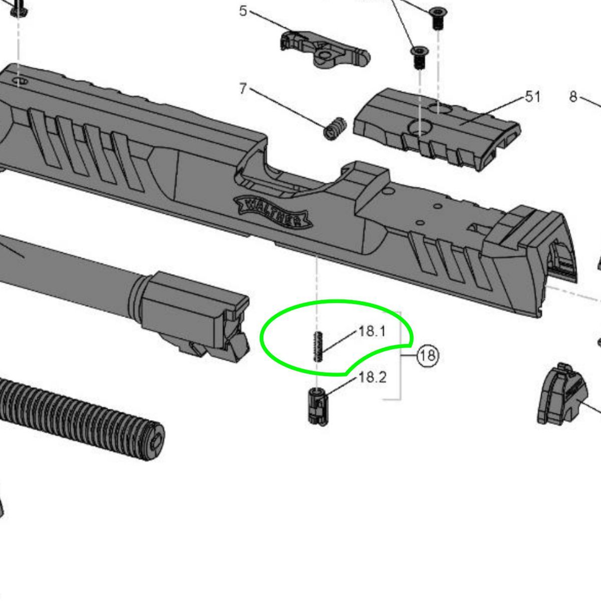Jedná se o díl c. 18.1 (Spring for safety plunger) dle rozkresu pistolí Walther PPQ/Q4/Q5 a PDP