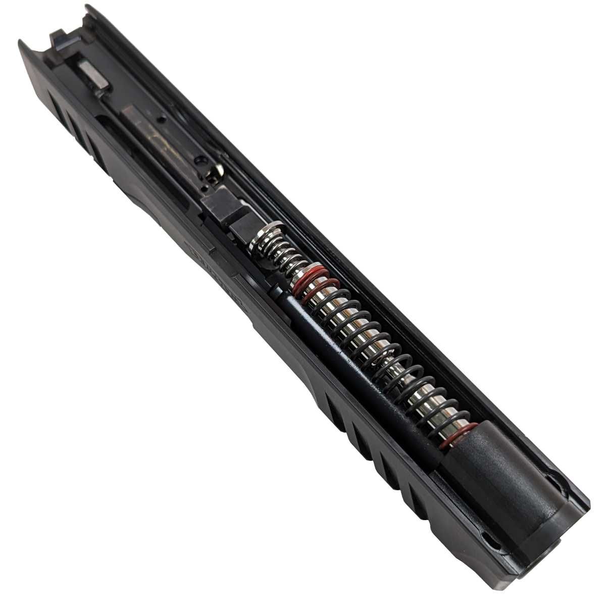 Základní cervená vratná pružina má stejnou sílu jako standardní vratná pružina Walther, nicméne i tak rozkládá zpetný ráz do delšího intervalu a navíc její sekundární pružina významne tlumí doraz záveru v zadní úvrati.