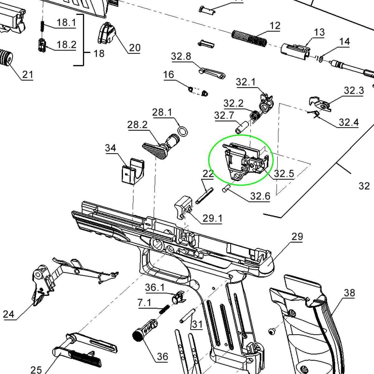 Jedná se o díl c. 32.5 (Sear housing / Abzuggehäuse) dle rozkresu Walther PDP.
