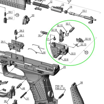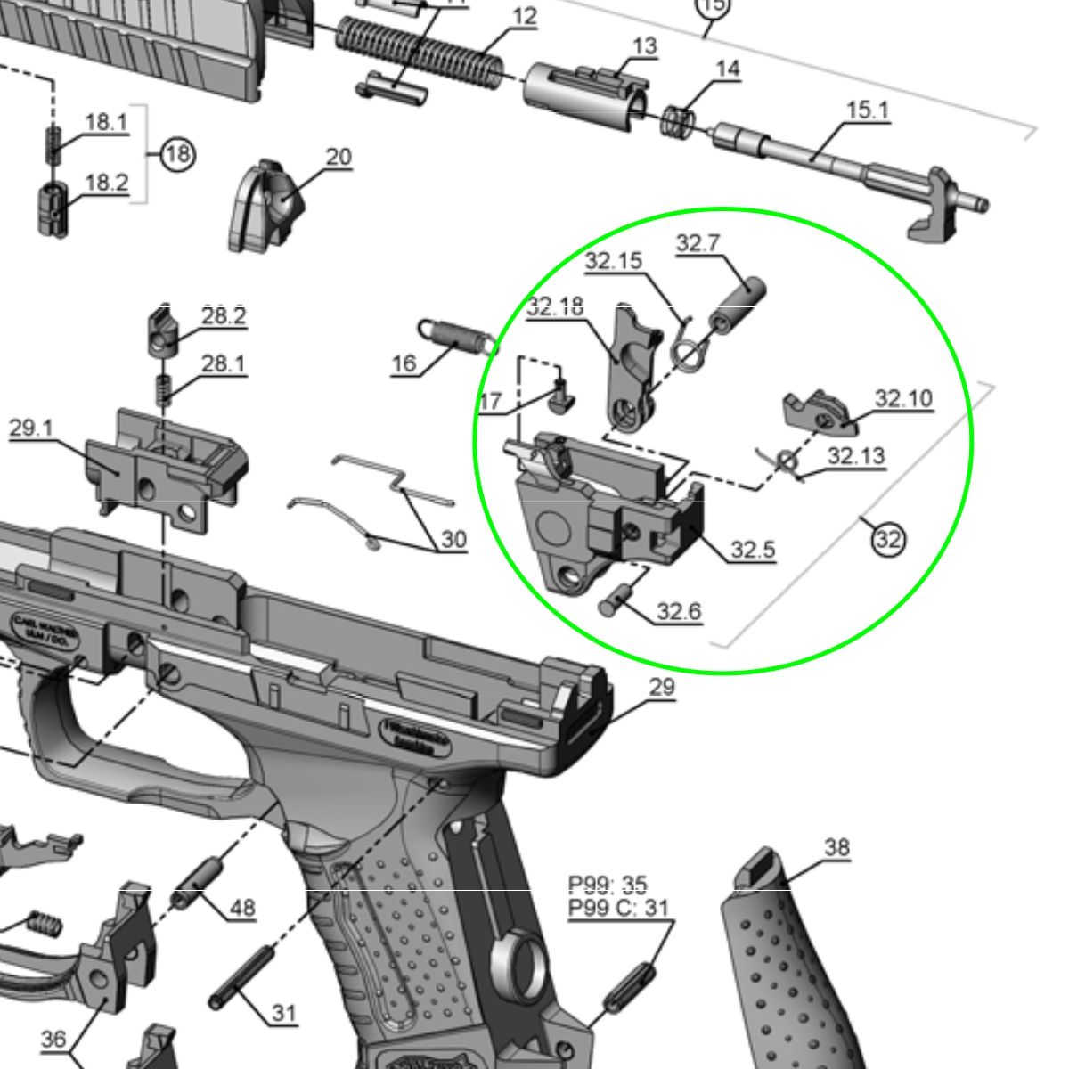 Kompletní sestava = díl c. 32 z rozkresu 268 84 76 pistole Walther P99 QA.