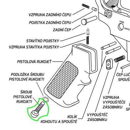 Pro lepši aretaci šroubu doporučujeme instalovat včetně podložky šroubu pistolové rukojeti.