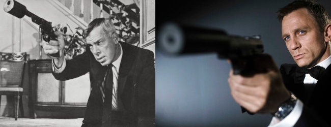 Vlevo Lee Marvin ve filmu The Killers (1964) s tlumičem na neupraveném revolveru, vpravo Daniel Craig jako agent 007 s tlumičem na pistoli, jež na jiných záběrech nemá žádné montážní rozhraní (foto Internet)