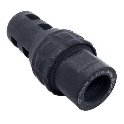 Účinná dvoukomorová úsťová brzda pro pušky a karabiny s úsťovým závitem 5/8"x18 UNF pro tlumení výšlehu a redukci zpětného rázu.