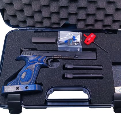 K dokonalému vyvážení přispívá standardně dodávané 100g závaží, které lze snadno instalovat pod hlaveň. O precizní míření se stará mikrostavitelné hledí LPA. Maximální kontrolu nad zbraní zajišťuje plně nastavitelná anatomická rukojeť (ořechové dřevo Blue Angel), kterou lze v případě potřeby vyměnit za pažbičky z modelů Classic či Dynamic.