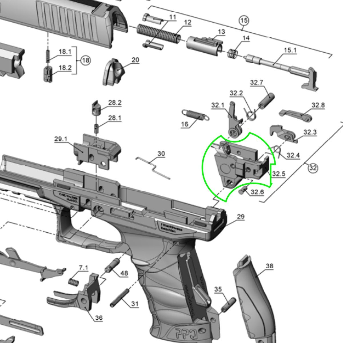 Jedná se o díl c. 32.5 dle rozkresu 278 44 67 pro pistoli Walther PPQ M1.