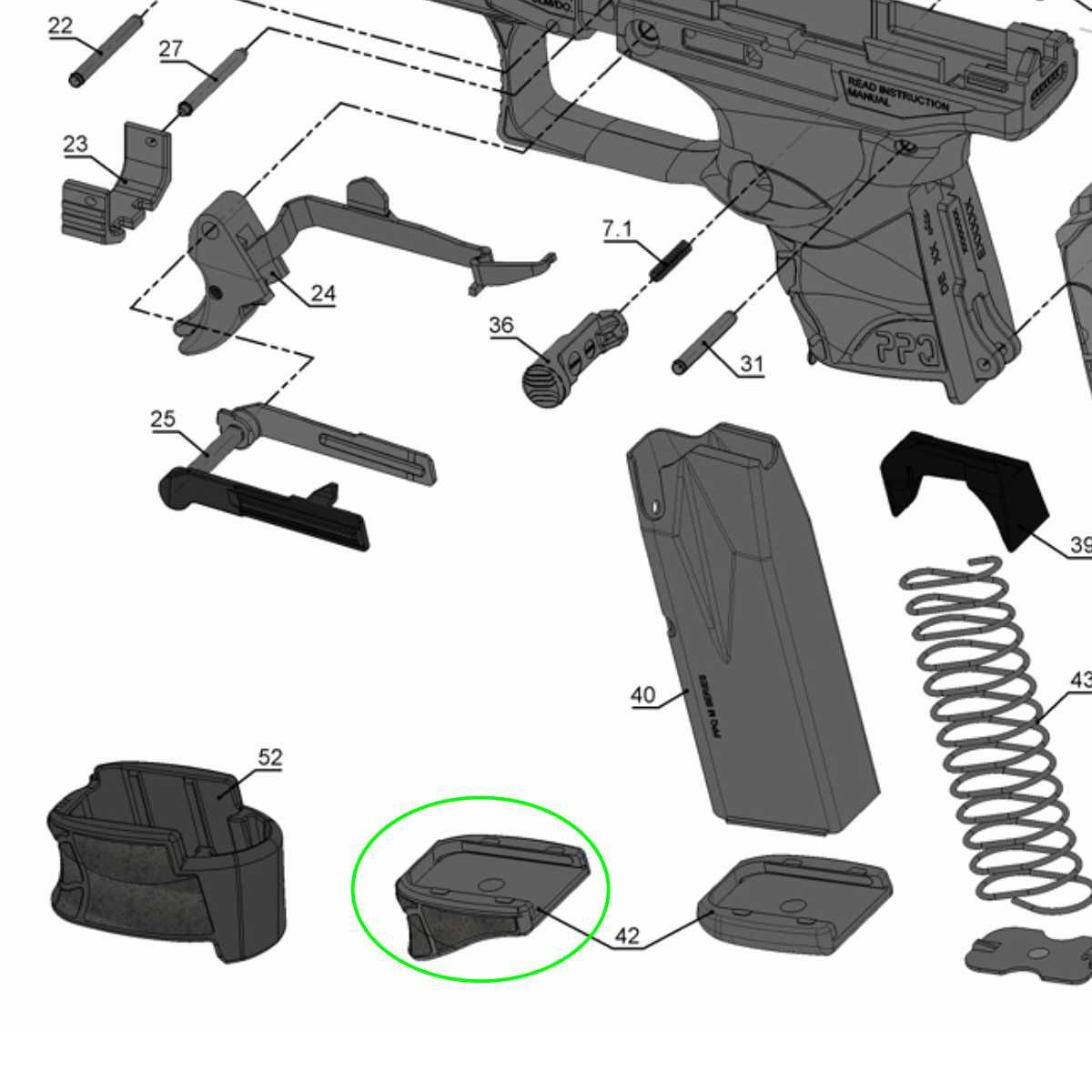 Jedná se o díl c. 42 (Magazine butt plate with extension ) dle rozkresu Walther PPQ.