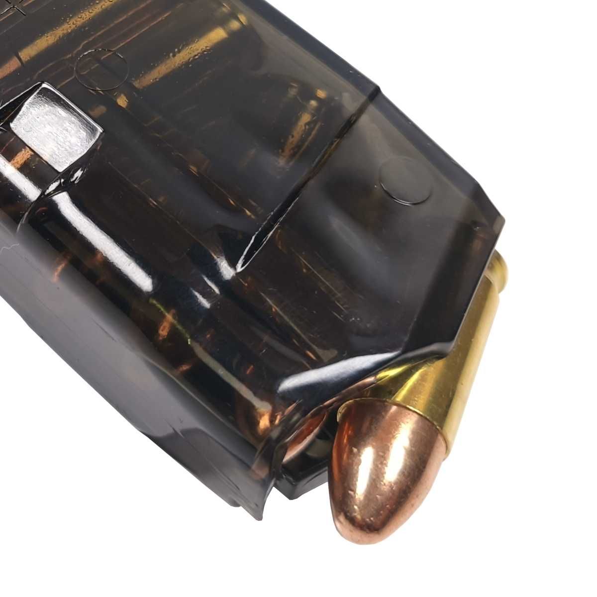 Zásobník je vyroben z pokročilého tvrzeného polymeru, který vyniká extrémní mechanickou odolností – bez poškození odolává pádům, agresivním chemikáliím, UV záření i teplotním extrémům. Díky průhlednému tělu máte okamžitý vizuální přehled o počtu nábojů v zásobníku, což zvyšuje vaši jistotu při sportovní i taktické střelbě.