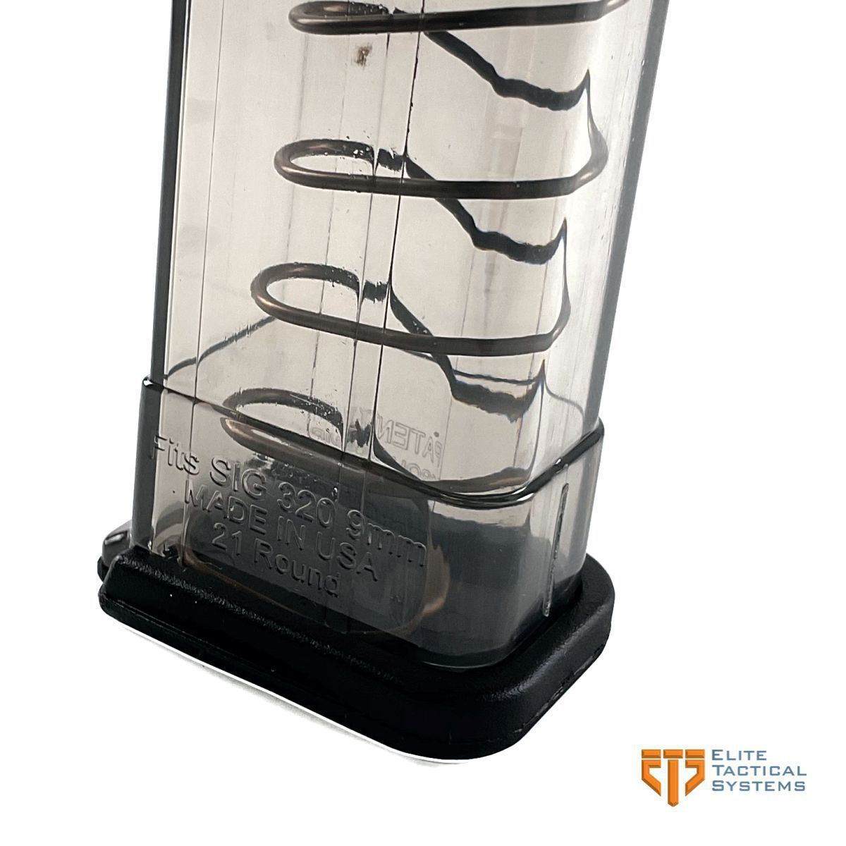 Univerzální zásobník pro pistole Sig Sauer P320 v ráži 9 mm Luger (9 × 19 mm). Kapacita zásobníku je 21 nábojů. Průhledné tělo poskytuje přehled o množství nábojů v zásobníku. Zásobník je možné rychle plnit pomocí nabíjecí pomůcky ETS C.A.M. pro pistolové zásobníky 9mm/40.