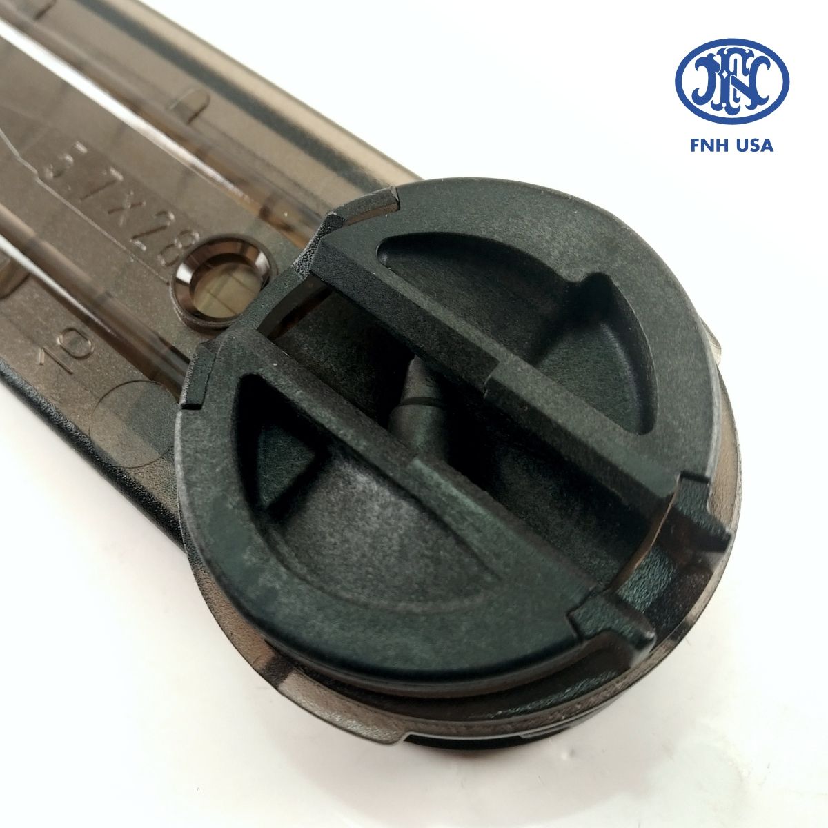 Originální zásobník FN Herstal vyrobený z tvrzeného transparentního polymeru pro ikonické zbraně P90 a PS90 v ráži 5,7×28 mm. Specifikem tohoto systému je unikátní uložení nábojů kolmo k ose zbraně, kdy je každý náboj před podáním do komory otočen o 90° díky precizní konstrukci podavače.