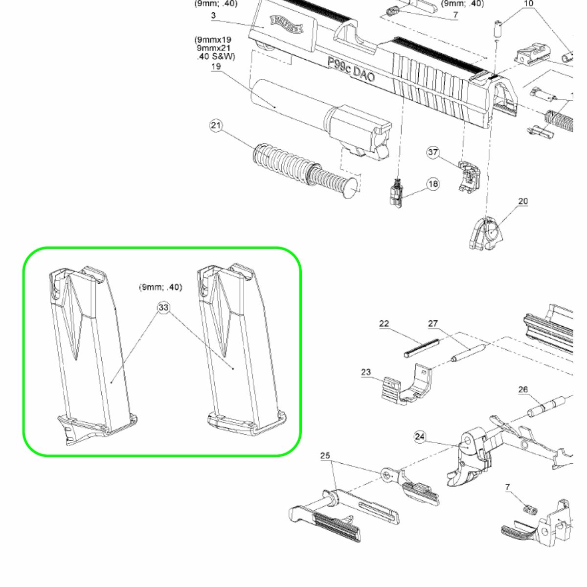 Originální náhradní zásobník z produkce německé zbrojovky Carl Walther, určený pro kompaktní verzi legendární pistole Walther P99 (P99c). Zásobník je navržen tak, aby přesně lícoval s krátkým rámem varianty Compact a zachoval její minimální profil pro skryté nošení.